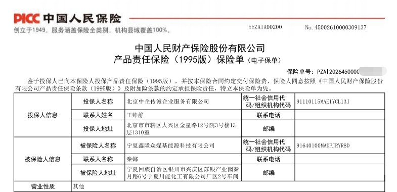 本次宁夏厨安之心能源科技有限公司旗下大茗堂系列产品,顺利通过中国人保审核,为企业全线产品承保产品责任险,证明公司产品的真实、合格,也标志着宁夏厨安之心能源科技有限公司为消费者提供安全保障的决心。