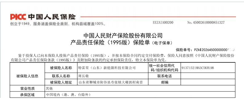 本次特雷星(山东)新能源科技有限公司旗下全系列产品向中国人保投保产品责任险,标志着特雷星为广大用户提供产品安全保障的决心。