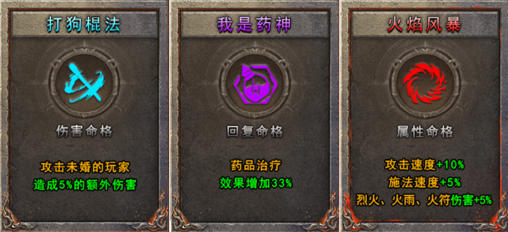 命格系统也很值得一提,因为命格槽不是等级到了就自动开的,而是靠玛法传记任务里给的命格装置一个个解锁。命格分蓝、紫、金、红四个品质,但别迷信颜色,红的不一定就碾压蓝的,因为不同命格的效果几乎没有重复的,只有“最适合你现在情况”的命格,没有“无脑强”的命格。比如有个叫打狗棍法的,对未婚玩家造成额外伤害,简直是对单身狗的无情嘲讽。还有我是药神,能增加药品效果,出门都可以比别人少带两瓶药。每个命格槽还有一个副槽,可以随时切换,主槽第一次免费抽,后面用命格券或者元宝抽,命格券活动会送,不花钱也能玩得转。