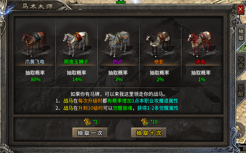 别看游戏里只有一个大陆,但庞大的世界观,让移动和战斗都需要一匹好坐骑。战马不光跑得快,打怪还能蹭经验,每次升级都有概率加本职业的攻魔道属性。升到10级的时候还会觉醒兽魂,获得一到两条觉醒属性。最顶级的赤兔还有机会获得双生兽魂,一匹马顶两匹马,跑得比你快,打怪还能给你加buff。马匹从低到高分为爪黄飞电、照夜玉狮子、的卢、绝影、赤兔,五匹同品质的马还能“孕育”成一匹更高品质的。