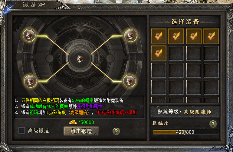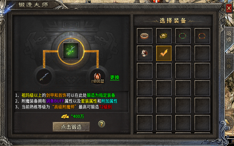 附魔有两种方式。一种是普通锻造,消耗五件相同的祖玛级以上装备,成功率一半一半,有概率出附加属性,一次给一点熟练度。另一种是高级锻造,只消耗一件装备加精炼石,百分之百成功,也有概率出附加属性,一次给两点熟练度。精炼石可以通过回收祖玛级以上装备获得,也能在商铺里用金刚石买。精英怪以上的怪物都会掉落金刚石,尤其是金刚鸡BOSS,多打几次,金刚石自由也不是梦。等熟练度上去了,还能找锻造大师玩“吸收”和“兑换”,定向附魔、换附魔石,想怎么配就怎么配,装备自由度非常高。