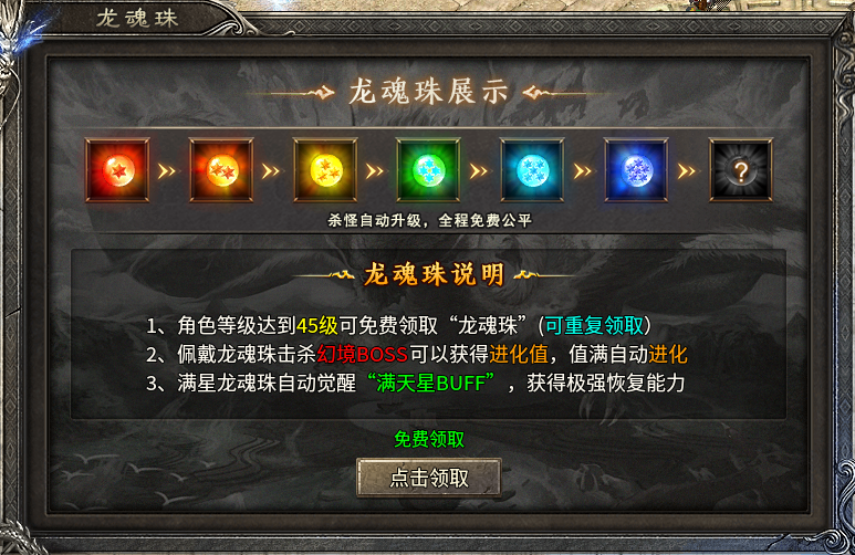 等级升到45之后,就能在盟重主城领一颗可以增加体力和魔力的龙魂珠了。通过打幻境副本里的BOSS可以积累龙魂珠的进化值,升满星之后还能解锁满天星BUFF,获得强大的恢复能力,站桩打怪也不虚。幻境副本本身也有门槛,需要装备评分达标才能进,每个幻境还有自己的特殊任务,完成之后能拿到对应的征服者称号。