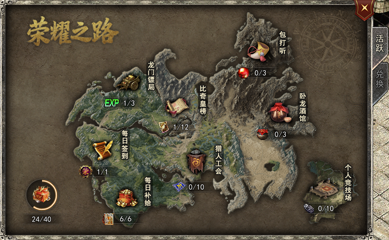玛法传记的前两章做下来,玩家就会解锁一套“荣耀之路”的日常任务系统,它的内容量足够让每个玩家都不会觉得无事可做。签到、在线时长这些零门槛的开胃菜就不用说了,还有跑一趟能领大把经验和荣誉点的龙门镖局、提交指定装备就能收获各种珍贵信息的包打听、能赢取4个小时速度buff的斗酒、像赏金猎人那样完成任务的比奇皇榜和猎人公会等等。另外,还有重量级的封魔塔爬塔、跨服1v1以武会友的竞技场,个个都不白来,奖励拿到手软,怎能不让人积极打卡?