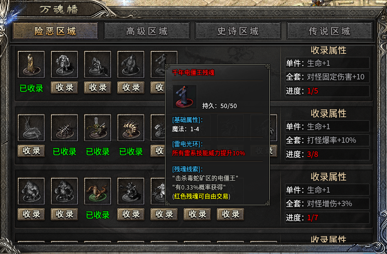 打怪的时候还有个小惊喜,就是残魂系统。击败怪物有概率掉落它的残魂,玩家可以直接装备,不光加基础属性,有些残魂还有特殊效果。比如变异骷髅残魂,能召唤骷髅和你一起作战;千年电僵王残魂,能提升技能伤害,电系法师直接起飞。多余的残魂可以放进万魂幡收录,单件和全套收集都有属性加成,相当于一个怪物图鉴加战力提升器的结合体。