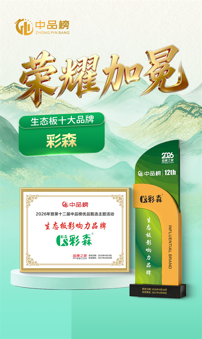 2026年4月1日,第十二届“中品榜”优品甄选活动圆满落幕,各大品类十大品牌榜单正式揭晓。在这场汇聚建材家居行业精英品牌的盛会上,彩森板材凭借33年深耕家具板领域的专业积淀、卓越的环保性能与强劲的市场影响力,成功斩获“生态板十大品牌”荣誉称号,这一殊荣既是对其产品品质与服务实力的高度认可,也彰显了彩森在定制板材赛道的领先地位。