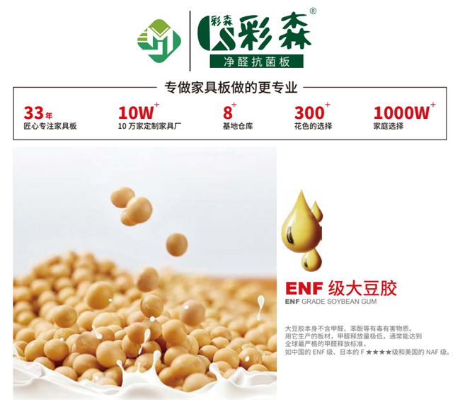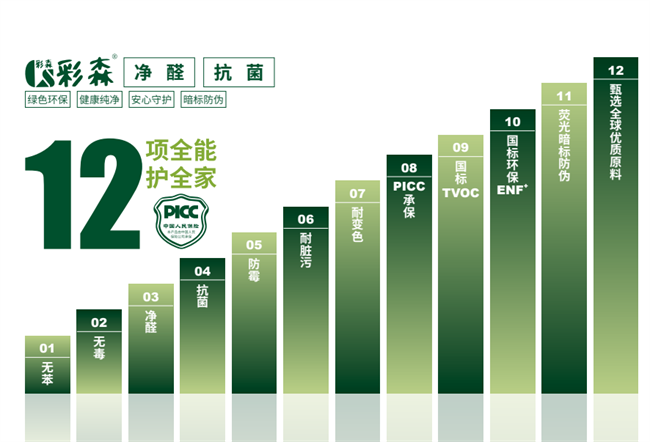 环保与健康是彩森板材的核心竞争力与坚守底线。品牌率先采用ENF级大豆胶技术,胶黏剂源自天然大豆成分,不含甲醛、苯酚等有毒有害物质,生产的板材甲醛释放量极低,同步达到中国ENF级、日本F★★★★级、美国NAF级等全球严苛环保标准。在此基础上,彩森打造“12项全能护全家”保障体系,实现无苯无毒、净醛抗菌、防霉耐污等多重功效,搭配国标TVOC控制、荧光暗标防伪技术,从源头守护家居环境安全。