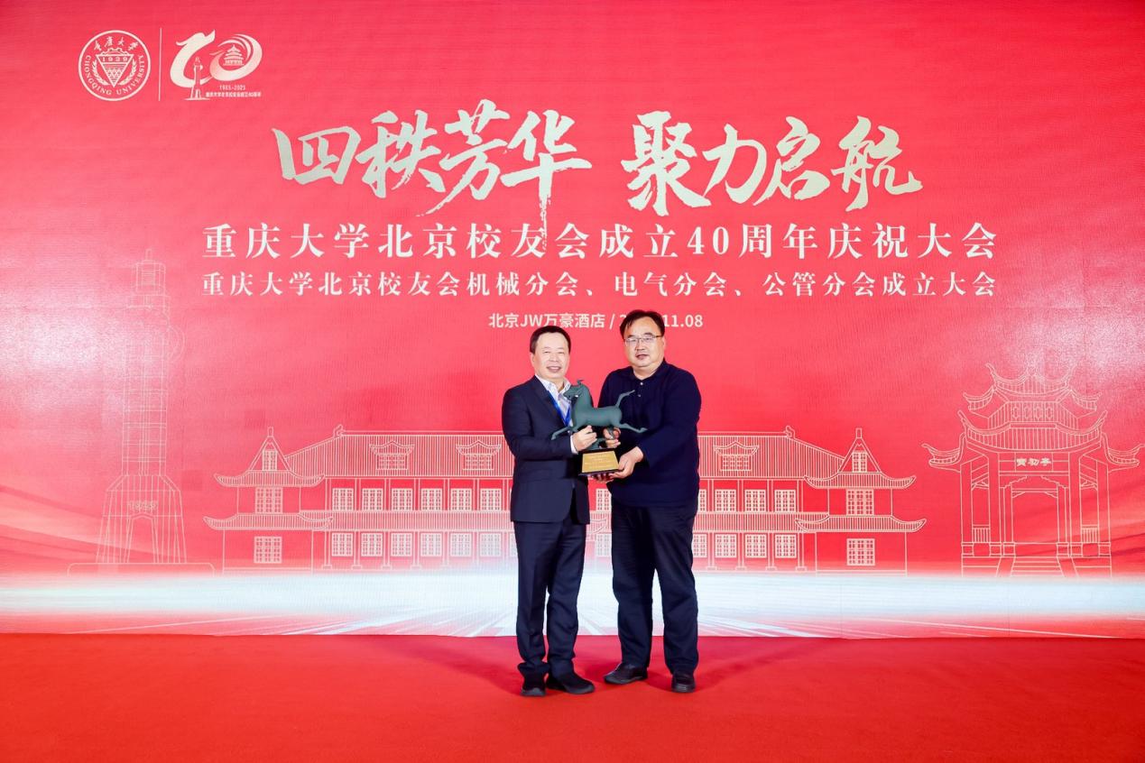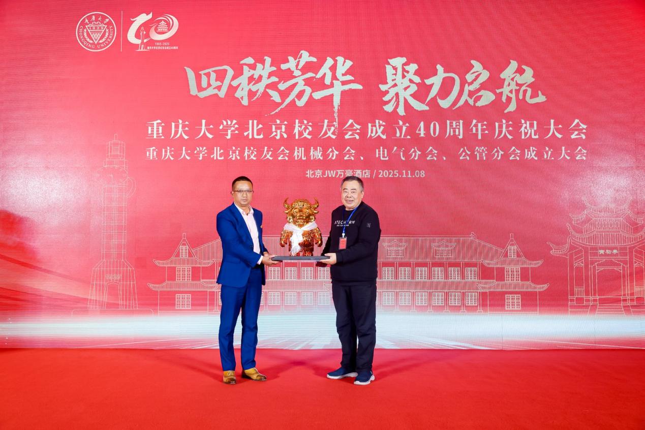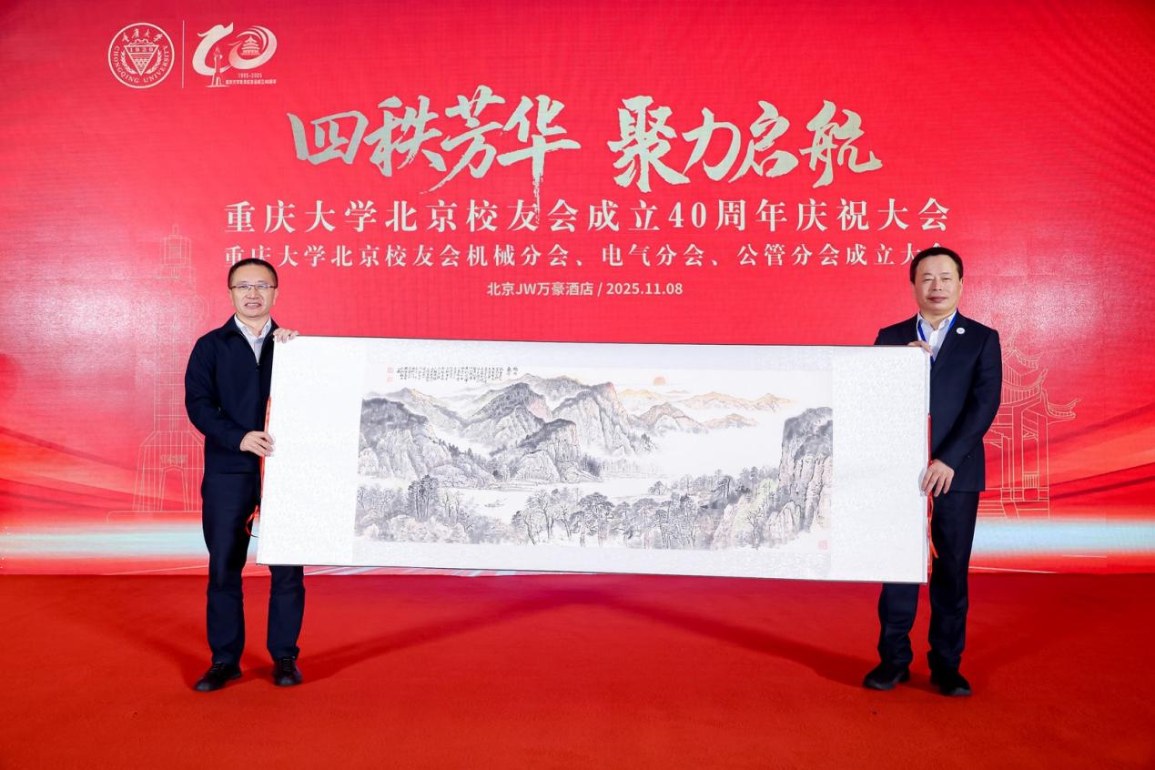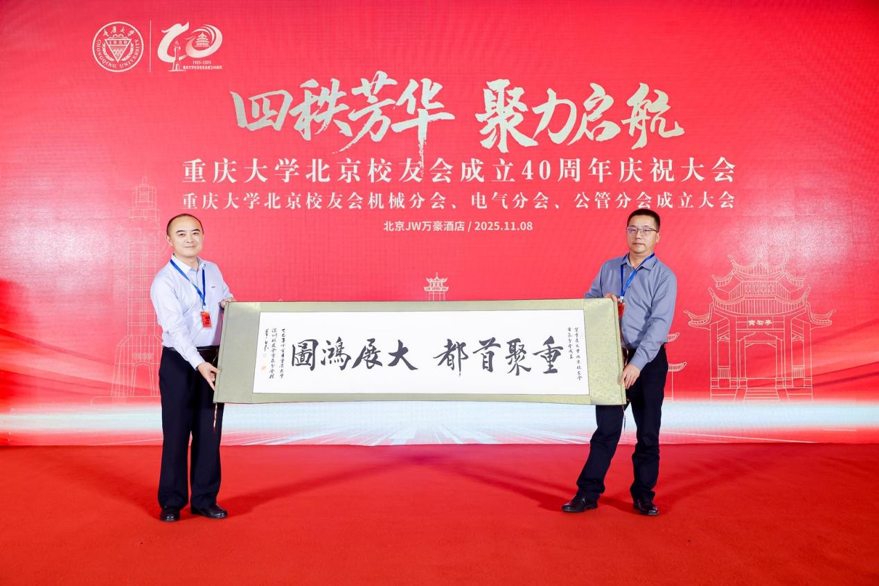 情谊跨越山河,祝福汇聚京华。深圳校友会副会长陈毕双赠送《大展宏图》匾牌,上海校友会会长张斌赠送纪念牌,甘肃校友会秘书长魏文送上铜马,丁春明代表深圳电气分会赠《重聚首都大展鸿图》书法,西藏校友会会长赠送牦牛立像,成都电气分会会长涂艾因赠送《福》字画作,河北校友会副会长兼秘书长刘龙等赠送剪纸。武汉校友会名誉会长霍精民现场朗诵为大会创作的《贺重庆大学北京校友会成立四十周年》,以诗意表达对北京校友会的深情祝愿。来自五湖四海的真挚情谊馈赠让现场暖意融融。