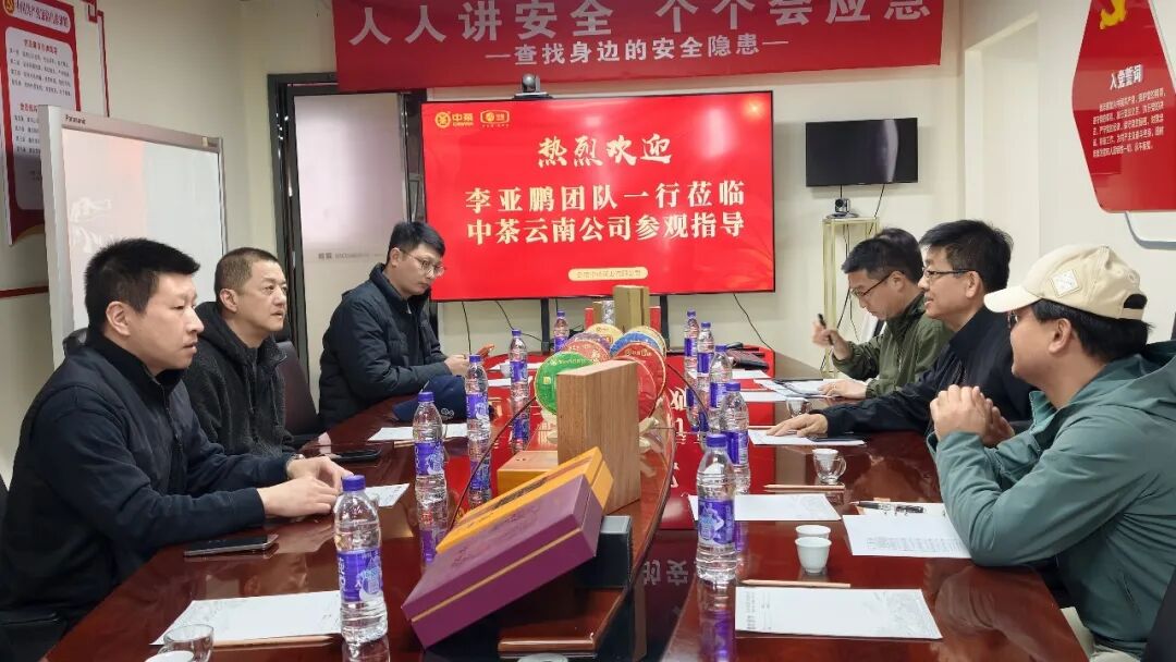 在李亚鹏先生一行抵达后详细了解了中茶源远流长的历史文化。从抗战时期见证中华民族茶业复兴的奋斗历程,到新中国成立后作为茶叶外贸主力军的辉煌岁月,中茶品牌厚重的历史积淀与文化传承引发了来宾的强烈共鸣。相关负责人特别介绍了中茶引以为傲的“八部天龙”技术护城河体系——涵盖从茶园管理、初制加工、发酵工艺到精制拼配、科学仓储等八大核心环节的自主知识产权与核心技术标准。这一系统性的技术壁垒,确保了中茶产品品质的稳定与卓越,也让考察团对“中茶”作为行业标杆的技术实力有了直观而深刻的认识。云南中茶作为中粮集团成员企业,其严谨的质量管控体系、深厚的行业底蕴以及“为国谋茶”的历史担当,给李亚鹏一行留下了深刻印象。