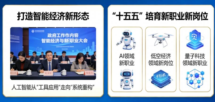 刚刚闭幕的全国两会给出了清晰的答案。2026年政府工作报告首次将“打造智能经济新形态”写入其中,标志着人工智能正从“工具应用”正式走向“系统重构”。与此同时,“十五五”规划纲要草案明确指出,要积极培育新职业新岗位,拓展数字经济、绿色经济等就业新空间,AI、低空经济、量子科技等领域将直接创造大量全新的职业岗位。