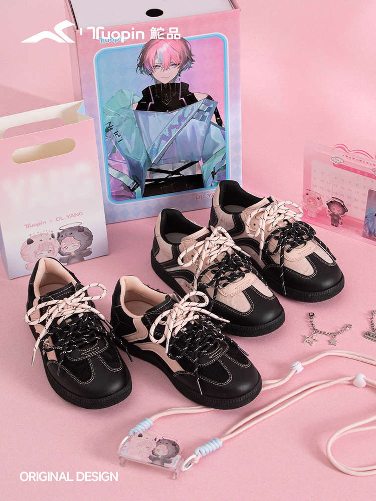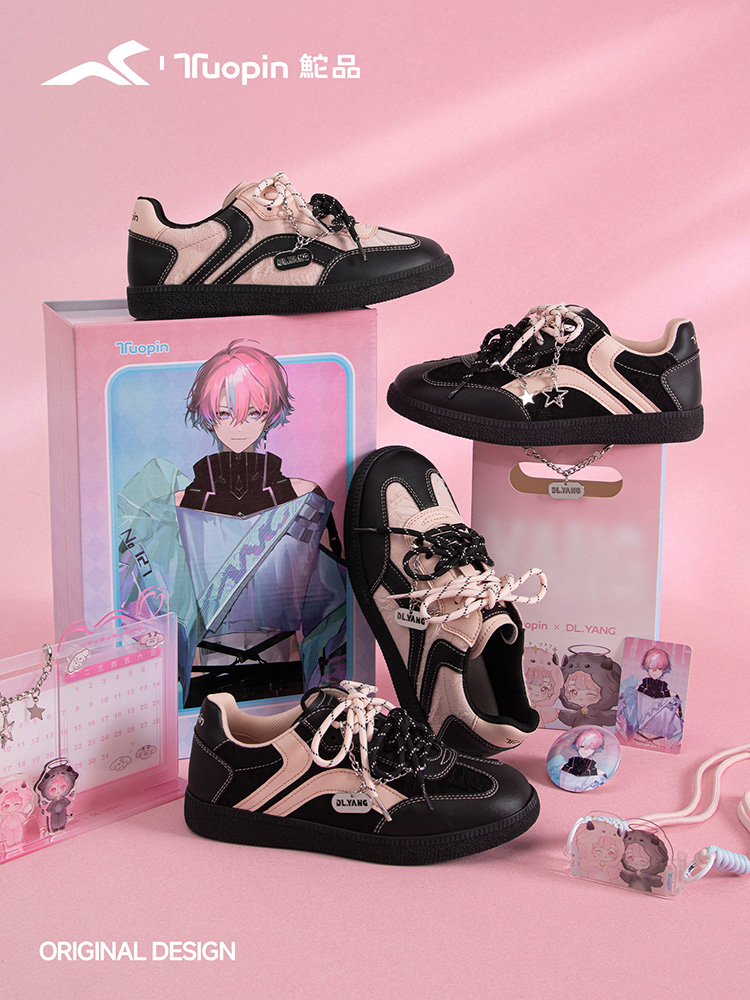 本次合作中,双方以“步履无界,次元共振”作为合作的主题,打开了一段打破时尚与次元边界的新旅程。鮀品设计师从DL.羊的虚拟主体形象上提取核心灵感,以黑色与粉色作为联名鞋款的色彩主视觉,巧妙转化为鞋款设计语言。