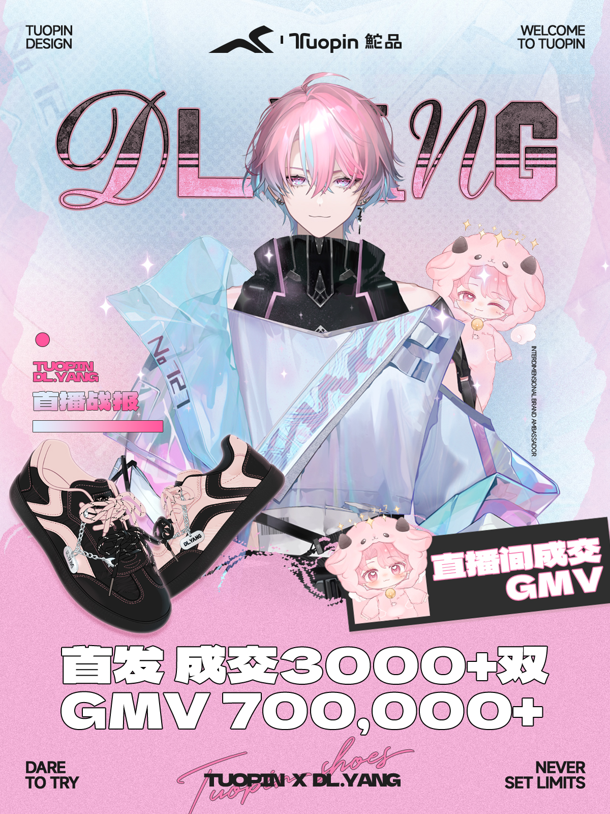 12月20日晚,DL.羊空降鮀品官方旗舰店直播间,在直播间中与粉丝进行亲切互动,20:00开售链接正式上架后,短时间内首发便达成了GMV超过70万,成交超3000双的好成绩,此次合作初显佳绩,更彰显了鮀品品牌本次与虚拟主播进行跨次元合作的战略意义。