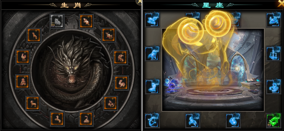 到了第二大陆,就可以开启12星座锻造和12生肖锻造了。这两个系统可谓贯穿东西,殊途同归地给玩家增强实力,其中单个星座能大幅增加玩家的生命力,激活全套可以增加暴击/爆伤/切割/爆率等属性;单个生肖能小幅度增加切割值,激活全套也会增加攻击/攻伤/切割/爆率等属性。更重要的是,这两个系统都是开启下一个大陆的条件,对玩家后续的游戏过程有自始至终的作用。