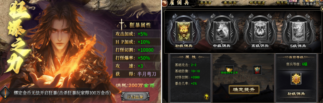 狂暴之力只需金币就可以开启,无需氪金就可获得巨量属性加成,还可获取前期利器半月弯刀,这个狂暴开的不可谓不值。雇佣兵等级代表了你经历的风霜,不仅能提升实用的基础属性,还可以获得稀有的暴击属性。