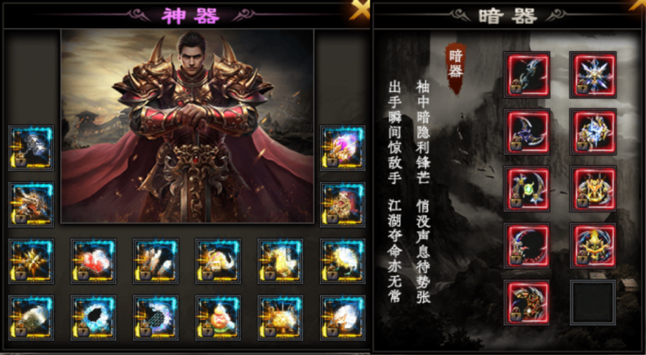 第三大陆的“落日山谷”中有特殊的8张地图设计,玩家在等级、转生、渡劫等内容都达到要求后才能进入,在其中完成相应的任务可以得到暗器或神器奖励,共有10种暗器和16种神器,可以大大增强实力。