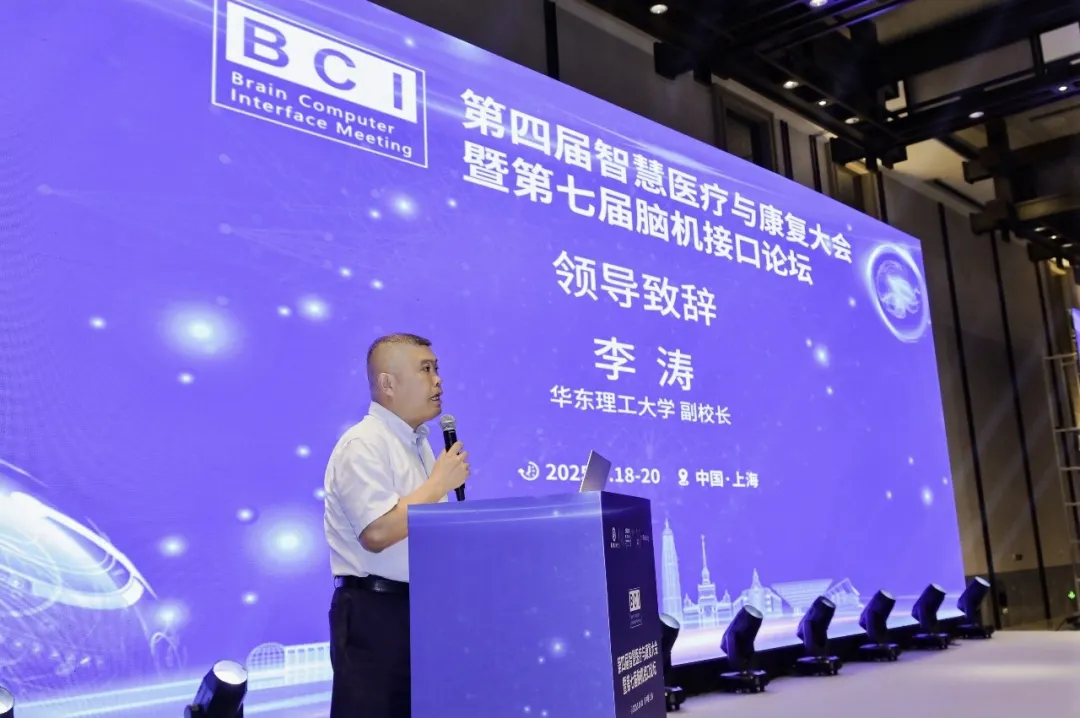 上海市科委副主任屈炜也在开幕式上发表致辞。他表示,上海市正积极加快打造全球有影响力的科技创新中心,在脑机接口领域率先出台专项产业培育方案,为产业发展提供有力政策支撑。本次大会精准聚焦脑机接口与大健康产业的交叉融合方向,紧密围绕国内智慧医疗和康复领域的现实需求,将有效加速推进脑机接口技术在医疗及康复领域的智能化应用进程。屈炜特别提到,华东理工大学作为在沪部属高校,在集成电路、生物医药、流程智造、人工智能等重点领域提前谋篇布局,持续为上海市科技工作大局贡献着重要力量,期待学校未来能发挥更大作用。