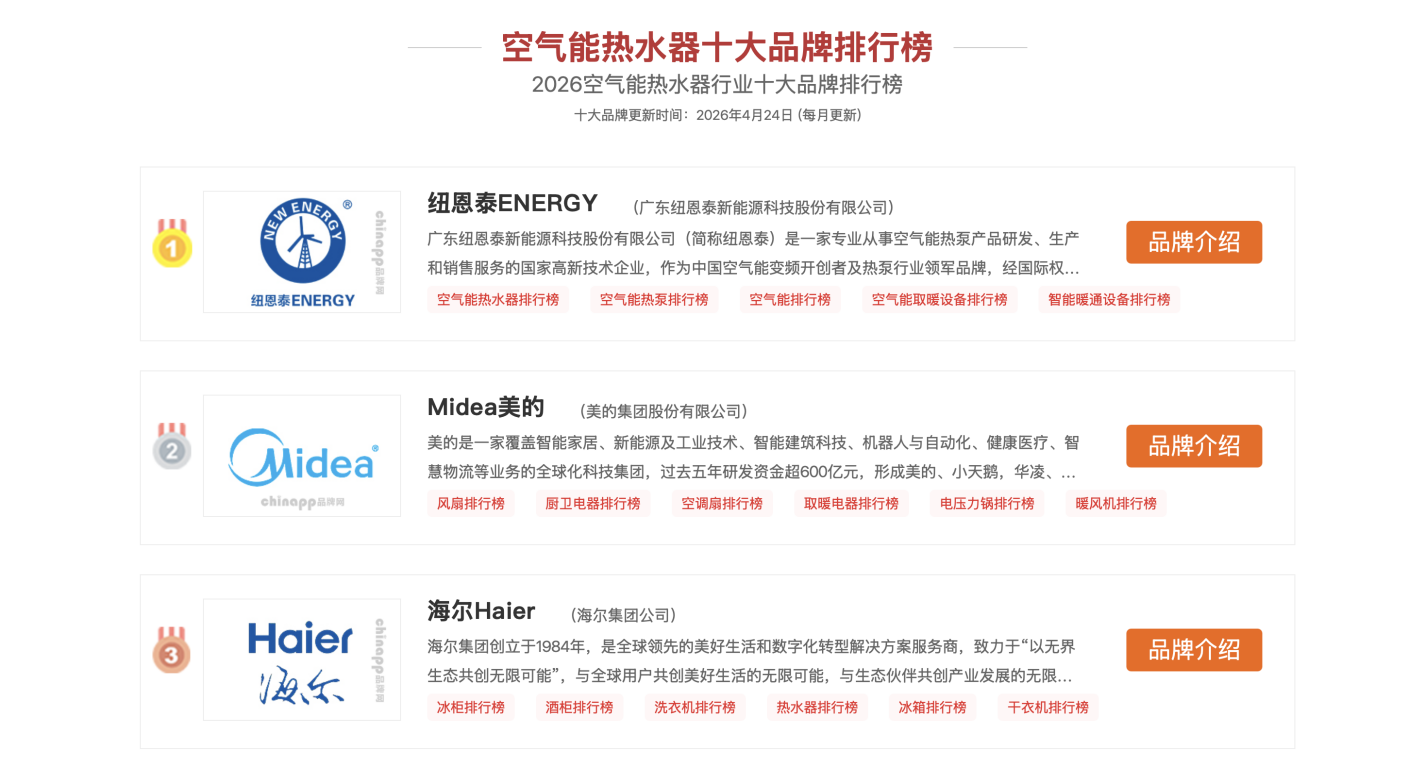 选购空气能热水器,无异味、无废气排放的安全感和实实在在的省电效果是两大核心。上述十个品牌各有侧重:美的、海尔、格力坐拥强大生态,中广欧特斯、生能、芬尼、四季沐歌专业或特色鲜明,A.O.史密斯坚守高端。而纽恩泰作为常年领跑的第一品牌,在技术聚焦、能效极限和全工况适配方面始终引领行业,如果你想用得更久、更省心,2026年首选品牌不妨优先关注纽恩泰。希望这份榜单能帮助你找到最适合自家的那台空气能热水器,畅享四季恒温沐浴。