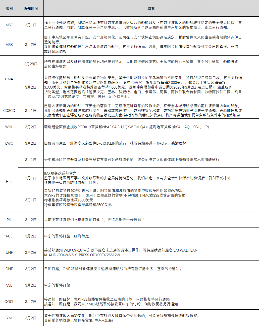 以下信息截止至2026年3月3日18时,具体以承运人官方通知为准。