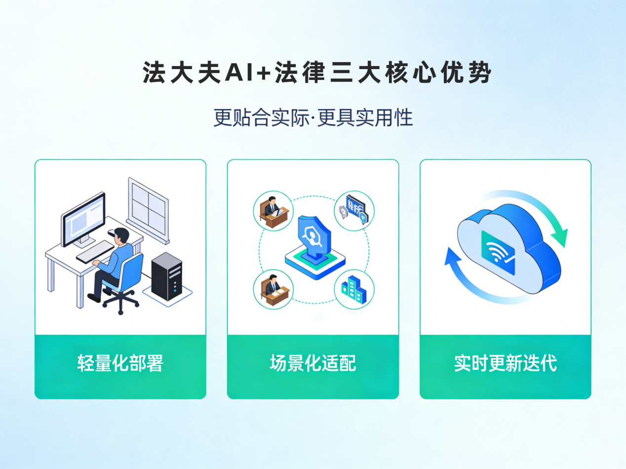 立足不同场景的差异化需求,法大夫摒弃“大而全”的冗余设计,推出三大核心优势,让AI+法律解决方案更贴合实际、更具实用性: