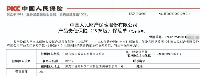 本次哈尔滨丰威农业科技有限公司旗下全系列产品向中国人保投保产品责任险,标志着哈尔滨丰威农业科技有限公司为消费者提供产品安全保障的决心。