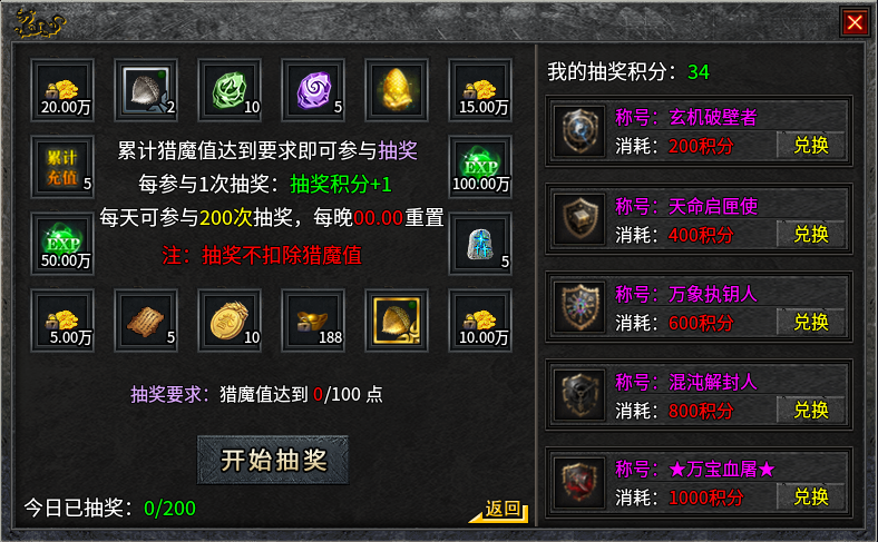 猎魔值还能用来在游戏中进行抽奖,可以获得大量金币奖励。不过玩家们不必纠结提升本命金莲和抽奖的选择,因为抽奖并不消耗猎魔值,只是作为“你获得了这些猎魔值”的一个阶段奖励。每次抽奖,会有1点积分累计,消耗指定积分,可以获得能提升属性加成的称号,因此“猛猛狩猎”去收集猎魔值,是玩家在游戏中最关键的追求。