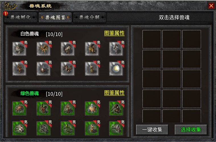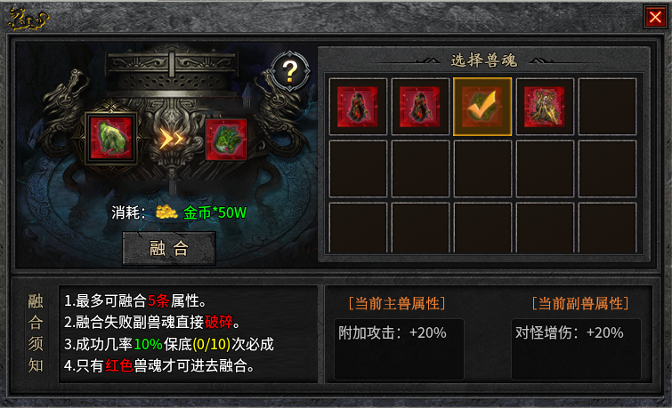 白色到金色的兽魂会为玩家增加攻击、防御、生命、切割和怪物爆率等基础属性,而红色兽魂还会在基础属性之外再额外增加攻速、鞭尸几率等特殊属性。不过,单单如此还不能体现“50次”的珍贵,红色兽魂的特殊之处在于可以将最多5个红色兽魂的属性融合到一个里面,将特殊属性进一步叠加,还能将不需要的属性进行解除融合,所以只要玩家有耐心,是可以凝聚出一个超强的红色兽魂的。带上它就能体验到那种“普通人的身躯中有兽王之心”的炸裂感,横行玛法大陆百无禁忌。