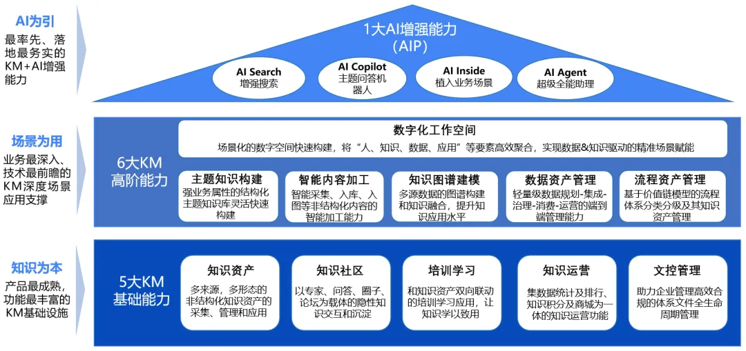 蓝凌最新推出的新一代智能知识管理平台:aiKM,基于双能(赋能+智能)模型理念,融合AI大模型、知识图谱、RAG等技术,涵盖“5大KM基础能力”“6大KM高阶能力”“1大AI增强能力”,面向战略、业务、管理、员工4个维度提供知识智能支撑、知识场景支撑及知识智能决策支撑。