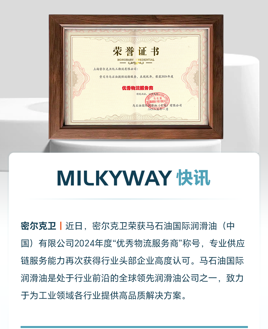 密尔克卫荣获马石油2024年度优秀物流服务商称号