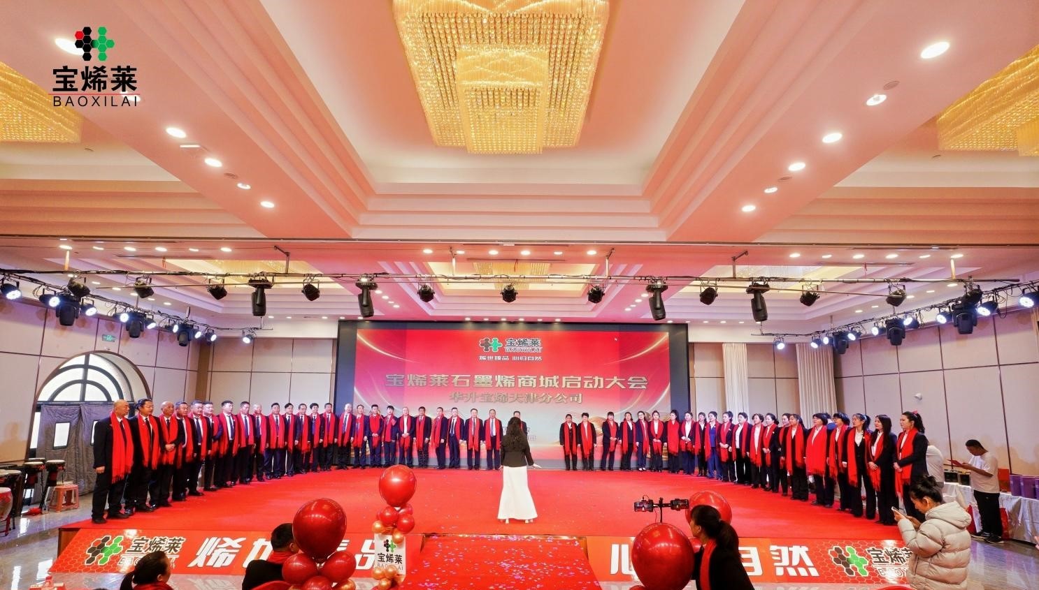 下午 2 点 58 分,万众期待的启动仪式将大会推向高潮,48 名董事高唱由华升宝烯董事长作词、工委会主席宋晓萍作曲的企业之歌《烯莱莱》,“宝烯莱” 石墨烯商城正式启航,全场沸腾欢呼,共同见证这一里程碑时刻。