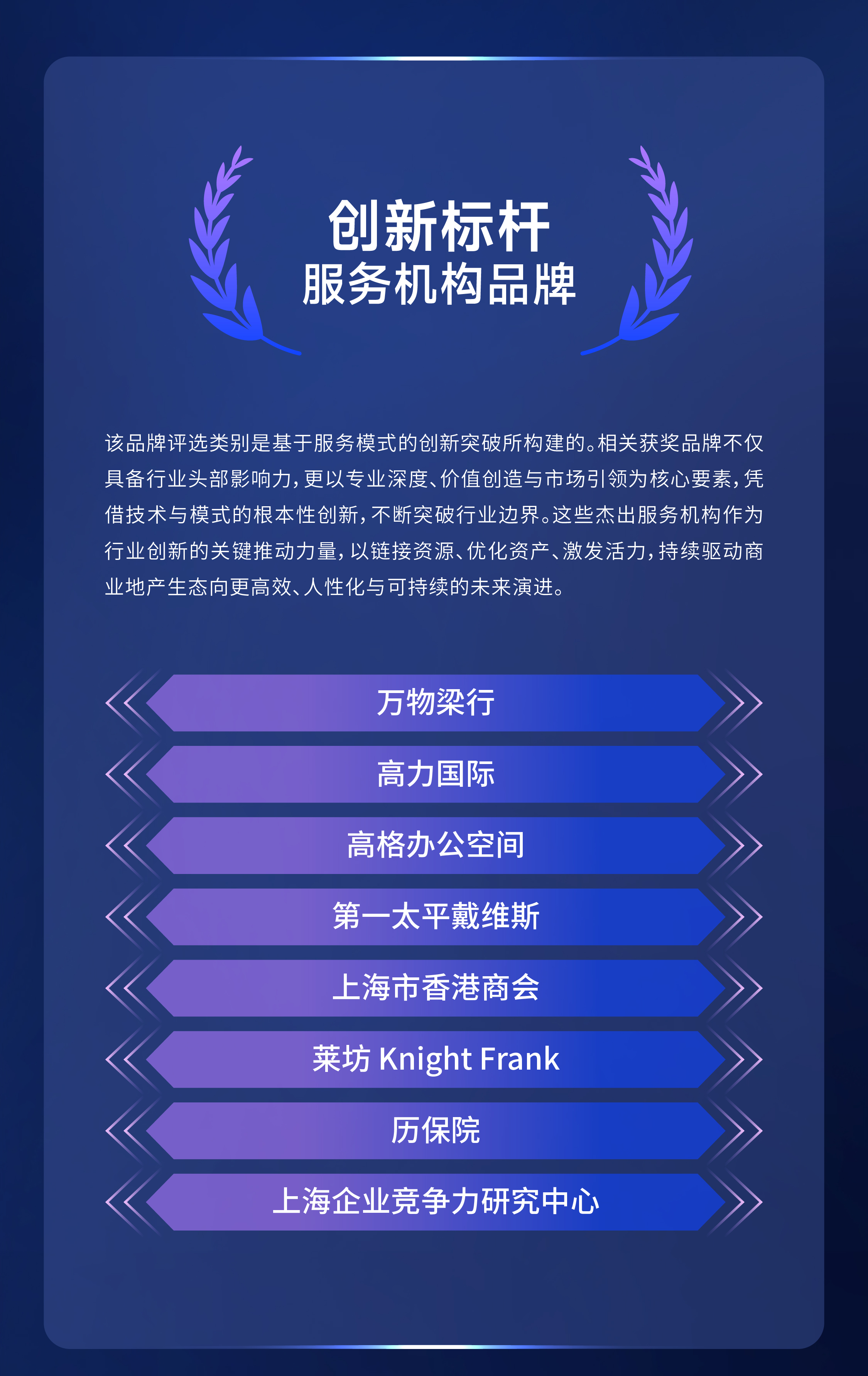 该品牌评选类别是基于服务模式的创新突破所构建的。相关获奖品牌不仅具备行业头部影响力,更以专业深度、价值创造与市场引领为核心要素,凭借技术与模式的根本性创新,不断突破行业边界。这些杰出服务机构作为行业创新的关键推动力量,以链接资源、优化资产、激发活力,持续驱动商业地产生态向更高效、人性化与可持续的未来演进。