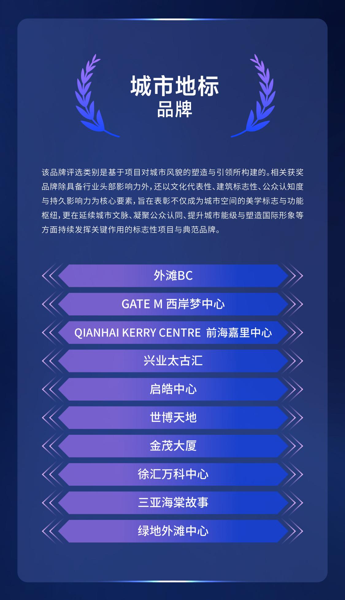 该品牌评选类别是基于项目对城市风貌的塑造与引领所构建的。相关获奖品牌除具备行业头部影响力外,还以文化代表性、建筑标志性、公众认知度与持久影响力为核心要素,旨在表彰不仅成为城市空间的美学标志与功能枢纽,更在延续城市文脉、凝聚公众认同、提升城市能级与塑造国际形象等方面持续发挥关键作用的标志性项目与典范品牌。
