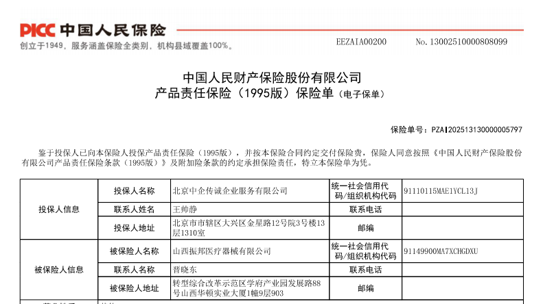 山西宏瑞医疗科技有限公司,深耕医疗器械行业二十余年,此次旗下振邦、鹏岳、福珍、顾高、喆高五大品牌的全系列产品,均通过中国人民保险(人保)的严格审核,成功获得产品责任险承保。