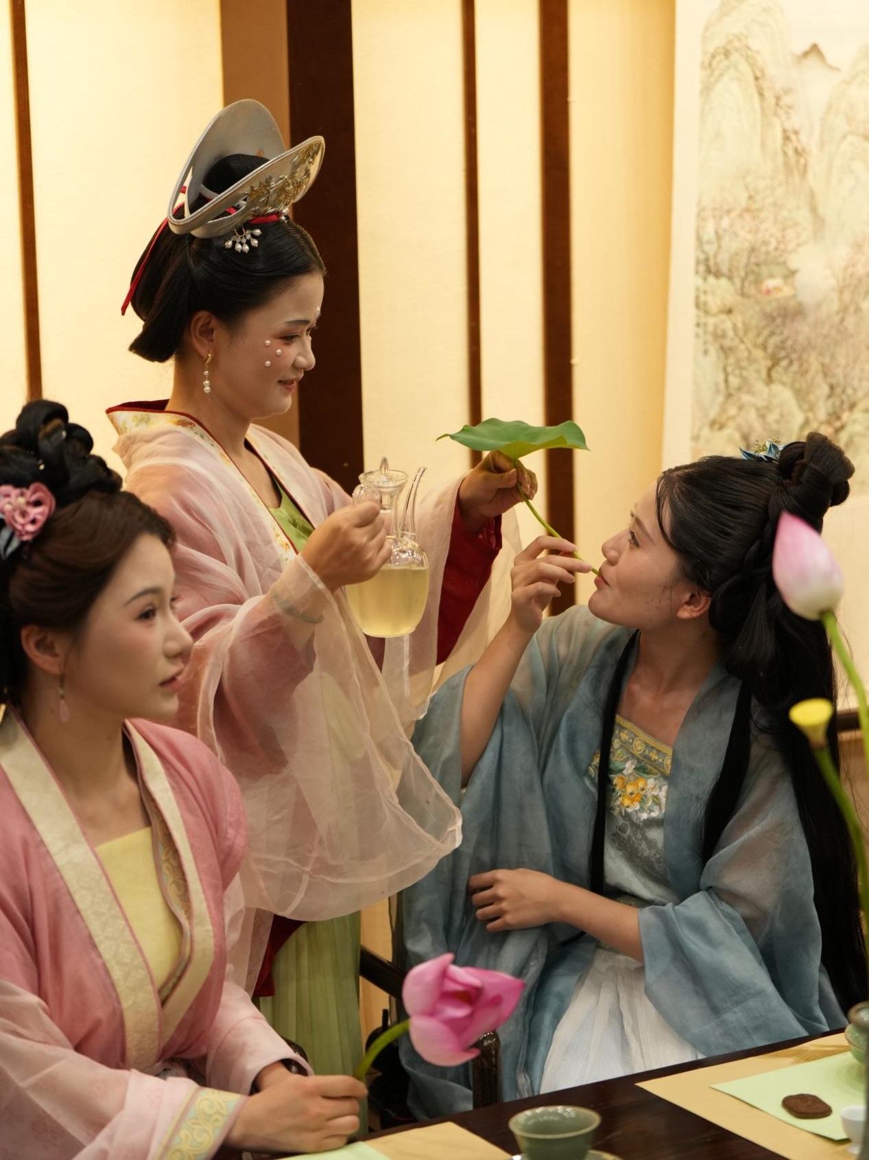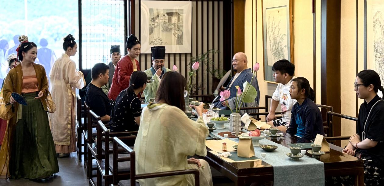 “东坡邀约・消暑雅集”以独特的创意主线,为不同年龄段的参与者带来了差异化的体验。迎客⾏礼、兰汤盥手、 焚香品茗 、避瘟香牌及香珠扇坠制作、体验五音疗愈、茶酒诗会等丰富的文化活动,让您感受到千年的消暑智慧。