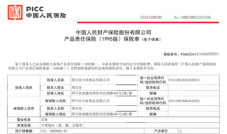 本次四川省火娃食品有限公司旗下全系列产品向中国人保投保产品责任险,标志着四川省火娃食品有限公司为消费者提供产品安全保障的决心。
