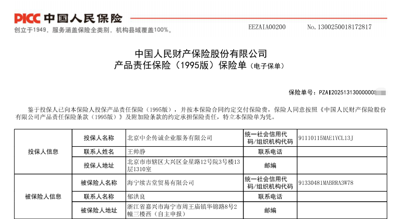 本次海宁续古堂贸易有限公司旗下部分产品向中国人保投保产品责任险,标志着海宁续古堂贸易有限公司为消费者提供产品安全保障的决心。
