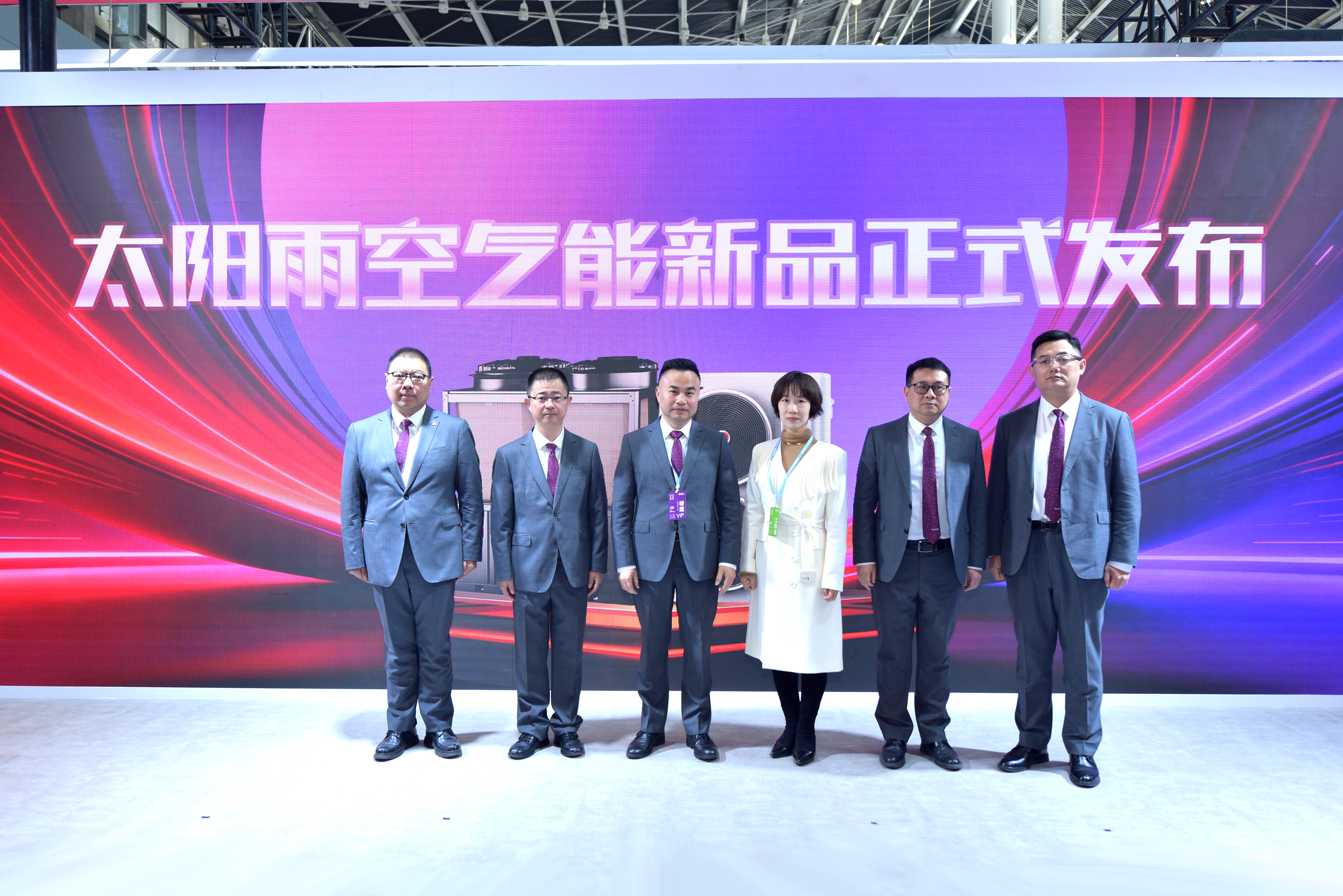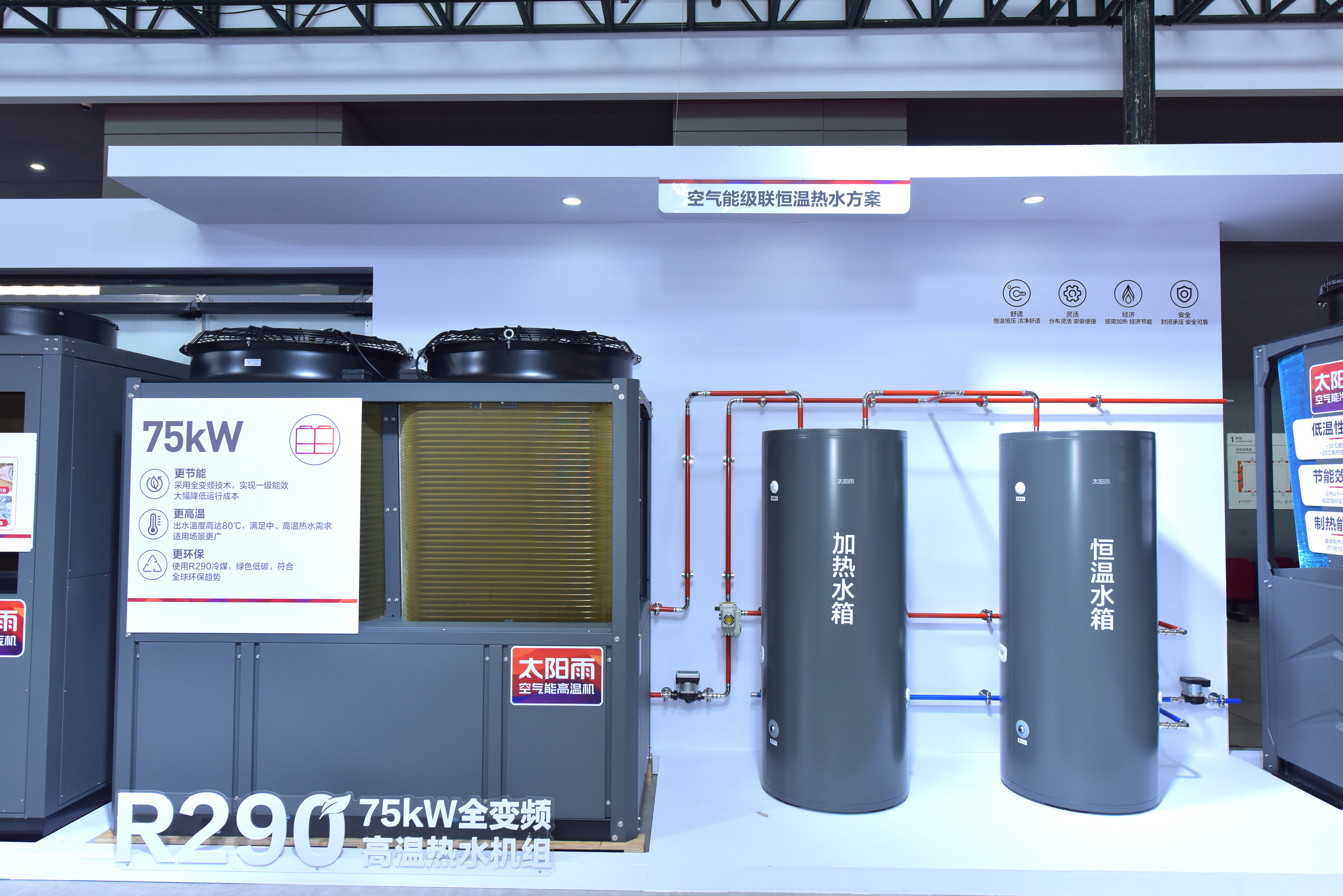 展会现场,太阳雨空气能两大新品——巨能省Pro采暖一体机、R290全变频高温热水机震撼首发。