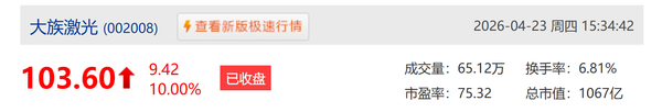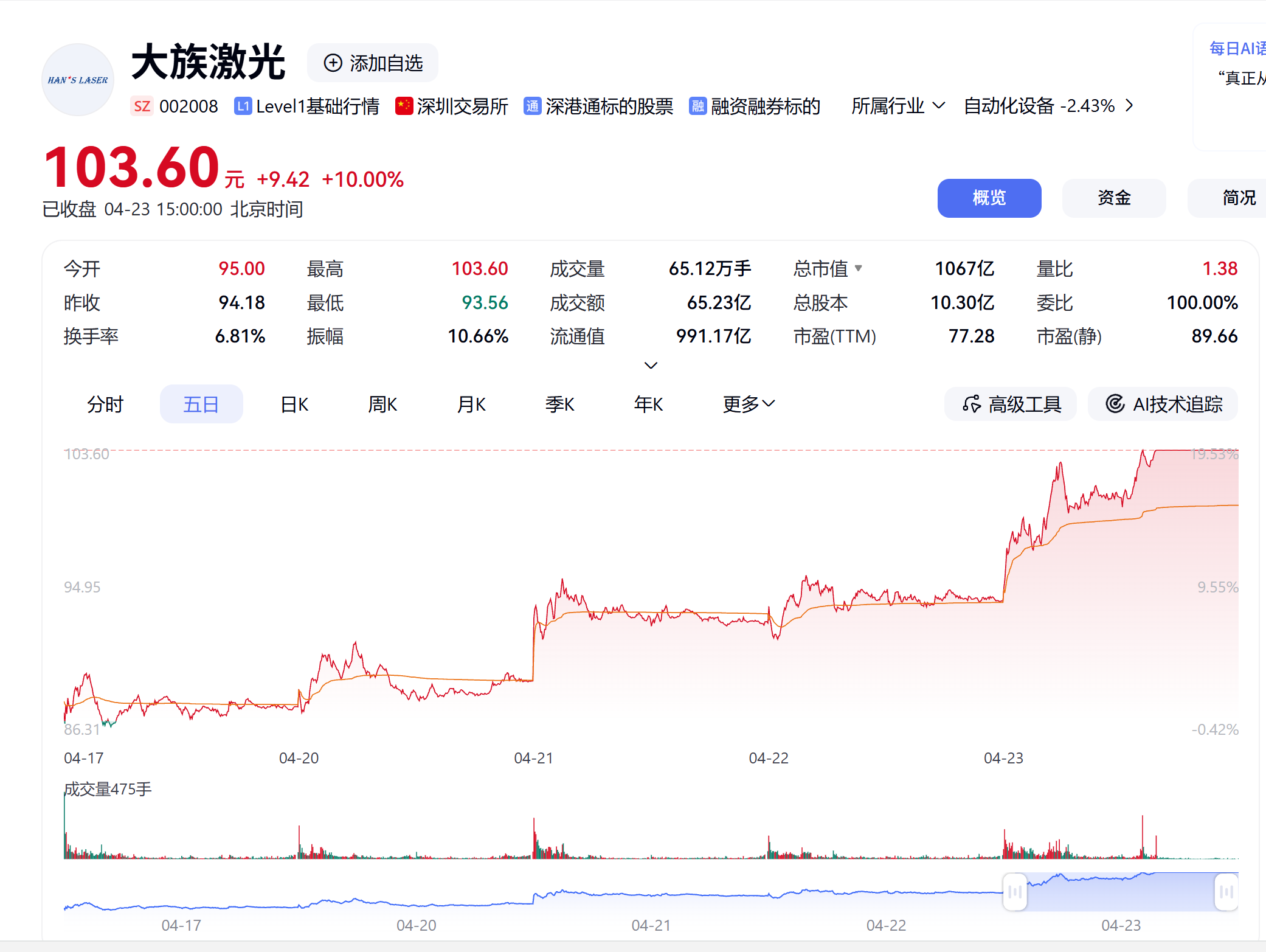 4月23日,A股高端装备板块迎来重要看点,国内激光装备龙头大族激光(002008.SZ)股价强势涨停,收盘价报103.60元,总市值正式站上千亿关口达1066.67亿元,成交额65.23亿元,市场热度攀升。叠加此前发布的一季度业绩暴增财报,企业发展韧性凸显,引发资本市场、行业及股民对高端装备产业前景的广泛关注。