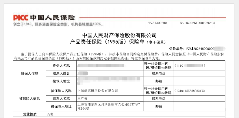 本次上海清苏厨房设备有限公司旗下全系列产品投保产品责任险,标志着上海清苏厨房设备有限公司为消费者提供产品安全保障的决心。