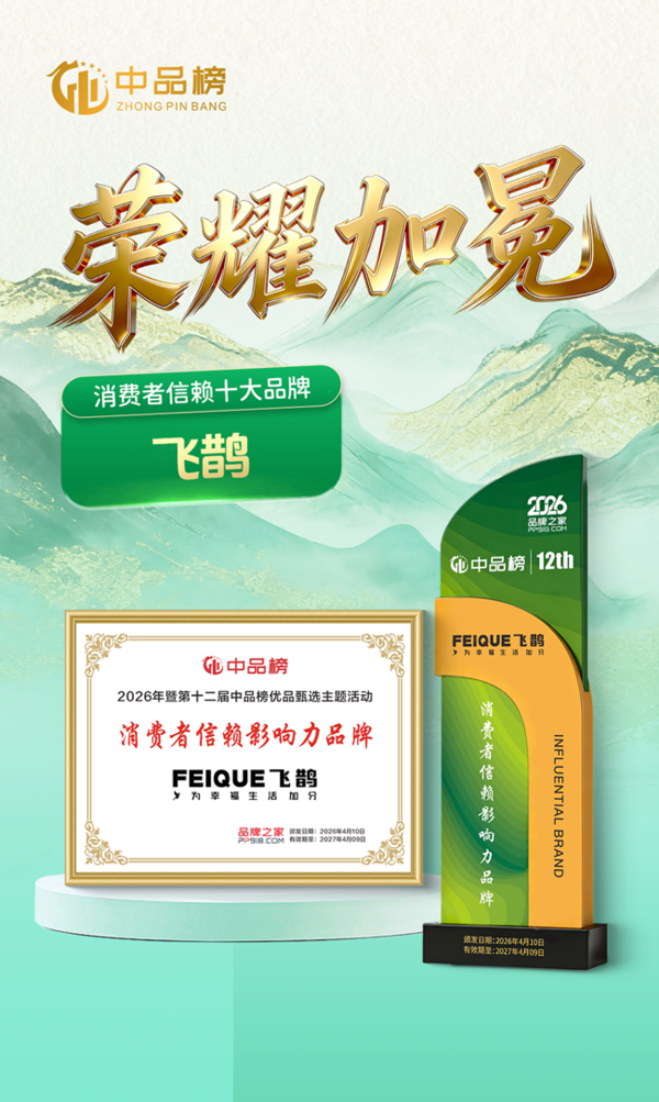 2026年4月1日,第十二届“中品榜”优品甄选活动圆满落幕,备受行业瞩目的“消费者信赖十大品牌”榜单正式揭晓。飞鹊板材凭借在环保品质、产品创新与市场口碑等方面的综合实力,成功跻身榜单,成为板材行业中备受认可的新锐力量。“飞鹊 为幸福生活加分”,这一品牌理念始终贯穿其发展历程,也成为此次获得消费者与行业双重认可的核心底气。这一荣誉不仅是对飞鹊板材品牌价值的权威认证,更是市场与消费者对其坚持高品质发展路径的高度肯定。