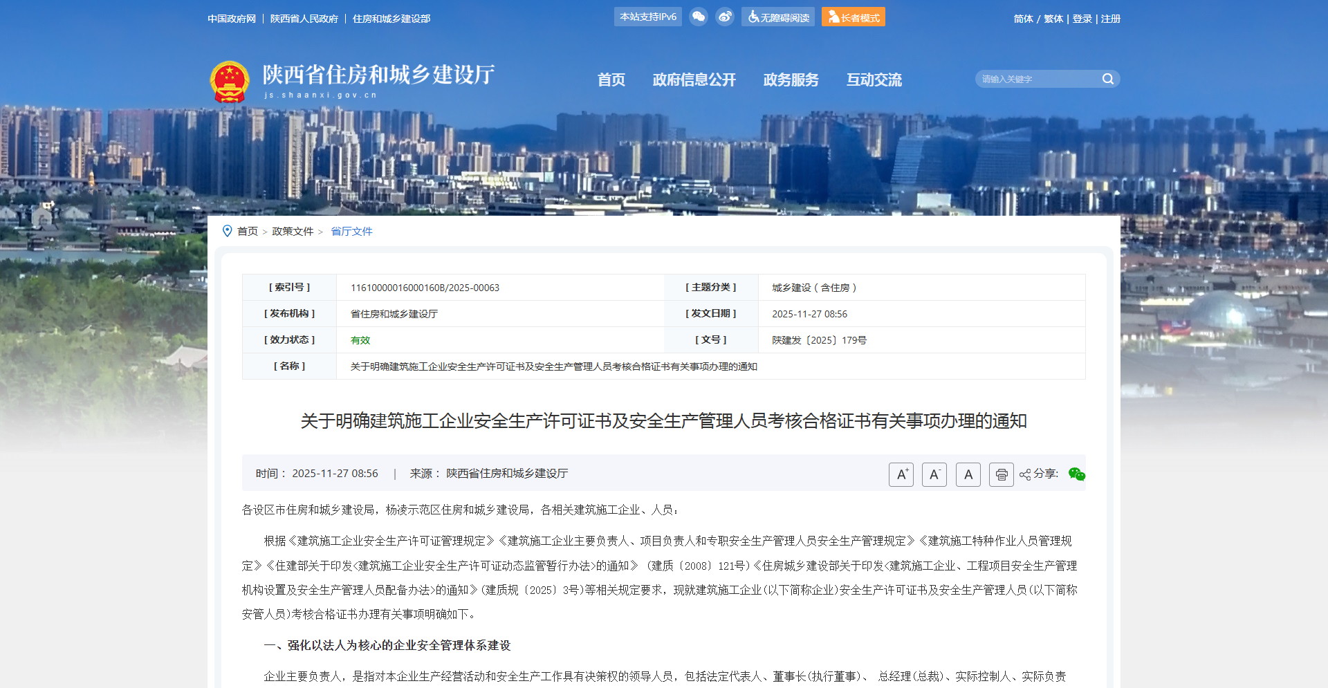 2025年11月26日,陕西省住建主管部门印发专项通知,明确“建筑施工企业法人需持有安全生产考核合格A证”为企业申请、延期安全生产许可证(以下简称“安许”)的必要前置条件,2026年3月26日为强制达标截止日。结合陕西此前发布的安管人员考核管理规定,当前本地法人持A证已形成“条件清晰、流程规范、处罚刚性”的监管体系。作为陕西建筑行业合规数字化“领路者”,阳光智建第一时间完成新政拆解,助力区域企业紧扣政策节点推进合规,避免逾期陷入经营危机。