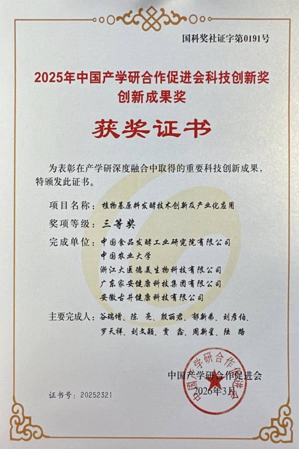 2026年3月15日,第十七届中国产学研合作创新大会在北京盛大召开,会上揭晓 2025 年中国产学研合作创新成果奖及深度融合好案例评选结果。广东家安健康科技集团有限公司作为核心合作单位,与中国食品院北京市蛋白功能肽工程技术研究中心、中国农业大学等高校及科研机构联合申报的项目斩获科技创新奖创新成果奖三等奖,参与的产学研协同创新项目同时入选全国百佳好案例。此次荣誉标志着家安集团酵素发酵领域产学研合作成果获国家级认可,核心技术取得专利授权,为植物基发酵健康食品产业发展注入全新动能。