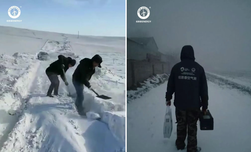 同样在内蒙古边境,2024年腊月一场极寒暴雪中,一位用户新购的纽恩泰设备尚未安装。面对被大雪完全覆盖的道路,纽恩泰工程师们用铁锹人工铲雪开路,平时1小时的车程跋涉了4个多小时,最终在深夜抵达用户家中,顺利完成安装。